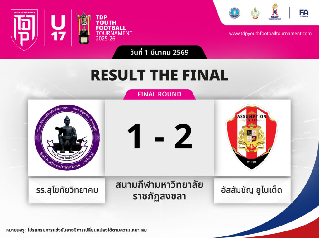 “อัสสัมชัญ ยูไนเต็ด” ยืนหนึ่งฟุตบอลเยาวชนแห่งชาติ คว้าแชมป์ TDP Youth Final 2025-26 รุ่น U17 บนเวทีสงขลา พร้อมถ้วยพระราชทานและเงินรางวัล 300,000 บาท สงขลา — บทสรุปของศึกฟุตบอลเยาวชนระดับชาติที่รอคอยมาตลอดทั้งฤดูกาล ปิดฉากลงอย่างสมศักดิ์ศรี เมื่อสโมสร อัสสัมชัญ ยูไนเต็ด ก้าวขึ้นสู่จุดสูงสุดของวงการฟุตบอลเยาวชนไทย ด้วยการคว้าแชมป์รายการ ทีดีพี ยูธ ไฟน่อล 2025-26 รุ่นอายุไม่เกิน 17 ปี ณ สนามมหาวิทยาลัยราชภัฏสงขลา จังหวัดสงขลา เมื่อวันอาทิตย์ที่ 1 มีนาคม 2569 นัดชิงชนะเลิศที่แฟนบอลทั่วประเทศต่างจับตา อัสสัมชัญ ยูไนเต็ด เอาชนะ โรงเรียนสุโขทัยวิทยาคม ไปด้วยสกอร์ 2-1 ท่ามกลางบรรยากาศเข้มข้น ทั้งสองทีมต่างแสดงฝีเท้าและสปิริตสูงตลอด 90 นาที ก่อนที่อัสสัมชัญฯ จะสามารถรักษาความได้เปรียบและปิดประตูชัยในท้ายที่สุด เส้นทางสู่แชมป์ของ อัสสัมชัญ ยูไนเต็ด ในทัวร์นาเมนต์นี้ไม่ได้ราบรื่นเสมอไป โดยเริ่มต้นจากรอบแบ่งกลุ่มด้วยการถล่ม ร.ร.กีฬาจังหวัดนครสวรรค์ 4-1 และ ร.ร.กีฬา อบจ.พังงา 5-0 จากนั้นในรอบ 8 ทีมสามารถเอาชนะ ราชนาวี เอฟซี ได้อย่างเด็ดขาด 4-0 แต่รอบรองชนะเลิศเป็นบทพิสูจน์หัวใจอย่างแท้จริง เมื่อต้องลุ้นระทึกจนถึงการดวลจุดโทษกับ หนองบัวพิชญ เอฟซี ผ่านมาได้ด้วยสกอร์รวม 7-6 (เสมอกันในเวลา 2-2) ก่อนจะปิดฉากความสำเร็จในนัดชิง ไฮไลต์พิเศษของรายการนี้คือ ภีมศิษย์ เชาวลิต นักเตะหัวใจแกร่งของทีม คว้ารางวัลผู้เล่นทรงคุณค่า (MVP) ประจำรายการ ตอกย้ำให้เห็นว่าความสำเร็จครั้งนี้เกิดขึ้นจากทั้งพลังทีมและความโดดเด่นในระดับบุคคล สำหรับรางวัลพิเศษสุดในรายการนี้คือ “ถ้วยรางวัลพระราชทาน” โดยพระบาทสมเด็จพระเจ้าอยู่หัวทรงพระกรุณาโปรดเกล้าฯ พระราชทานตราสัญลักษณ์โครงการส่งเสริมการกีฬาเพื่อพัฒนาชาติไทย ในพระบรมราชูปถัมภ์ ไปประดิษฐานบนถ้วยรางวัล เหรียญ และประกาศนียบัตร ซึ่งถือเป็นเกียรติยศสูงสุดที่นักเตะเยาวชนไทยคนหนึ่งจะได้รับตลอดเส้นทางการแข่งขัน นอกจากถ้วยพระราชทานแล้ว ทีมแชมป์ยังรับเงินรางวัล 300,000 บาทกลับบ้านอีกด้วย ขณะที่ ในนัดชิงอันดับ 3 ซึ่งจัดขึ้นก่อนหน้าในเวลา 16.00 น. ของวันเดียวกัน หนองบัวพิชญ เอฟซี เอาชนะ ร.ร.กีฬาจังหวัดนครสวรรค์ ไปด้วยสกอร์ 2-1 คว้าเหรียญทองแดงกลับบ้าน รายการ TDP Youth Football Tournament เป็นโครงการของภาครัฐ ภายใต้การดำเนินงานร่วมกันของกระทรวงการท่องเที่ยวและกีฬา, การกีฬาแห่งประเทศไทย (กกท.), กองทุนพัฒนาการกีฬาแห่งชาติ (NSDF) และสมาคมฟุตบอลแห่งประเทศไทย ในพระบรมราชูปถัมภ์ (FAT) มุ่งพัฒนาฟุตบอลเยาวชนไทยอย่างครบวงจรตั้งแต่ระดับรากหญ้าสู่เส้นทางอ